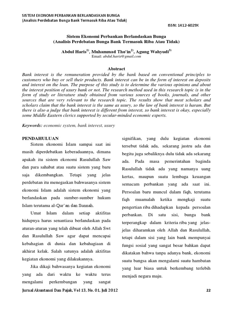 by DA Mutaqin · 2019 — 1 Abdul Haris, “Sistem Ekonomi Perbankan Berlandaskan Bunga (Analisis Perdebatan Bunga Bank Termasuk. Riba Atau Tidak),” AKutansi Dan Pajak ...