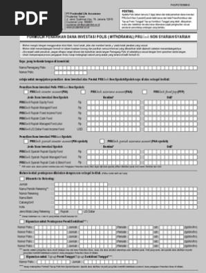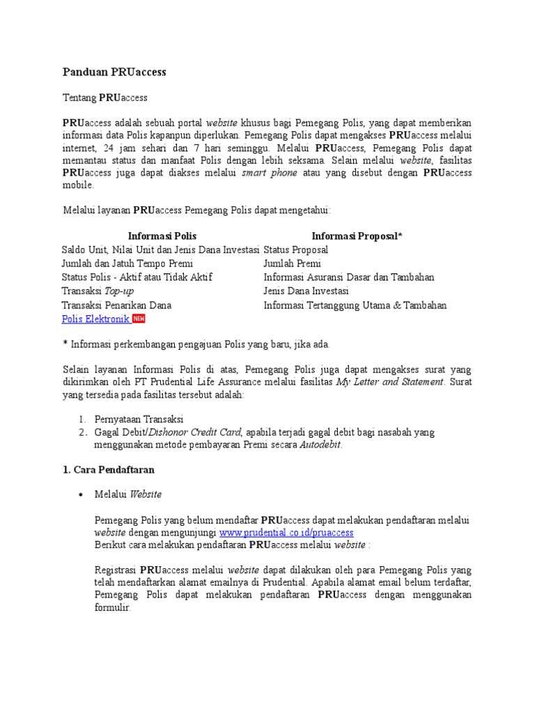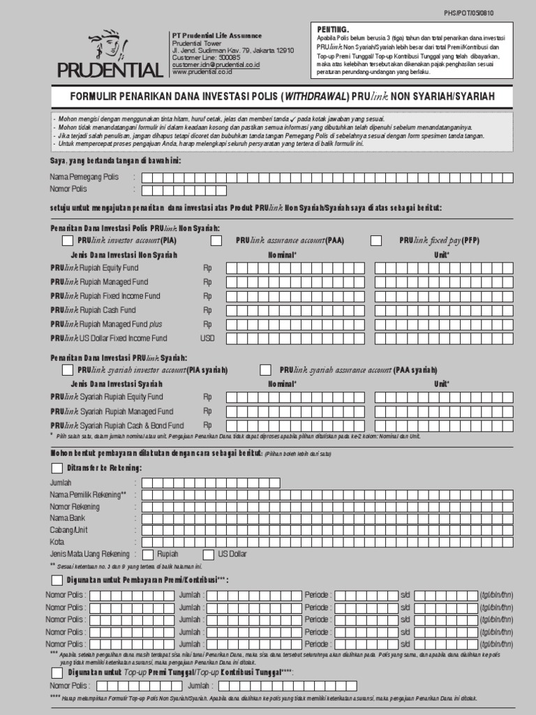 Formulir klaim, perubahan polis dan pertanggungan, pembuatan kepesertaan & polis baru, cara pembayaran, pembayaran manfaat, dan lain-lainnya Manulife ... Transaksi Penarikan Dana, Informasi Tertanggung Utama & Tambahan. Polis Elektronik ... Berikut cara melakukan pendaftaran PRUaccess melalui website :. Fleksibilitas dalam bertransaksi, baik penambahan dana, penarikan dana atau ... dari Dana Investasi PRUlink yang diterbitkan oleh PT Prudential Assurance.