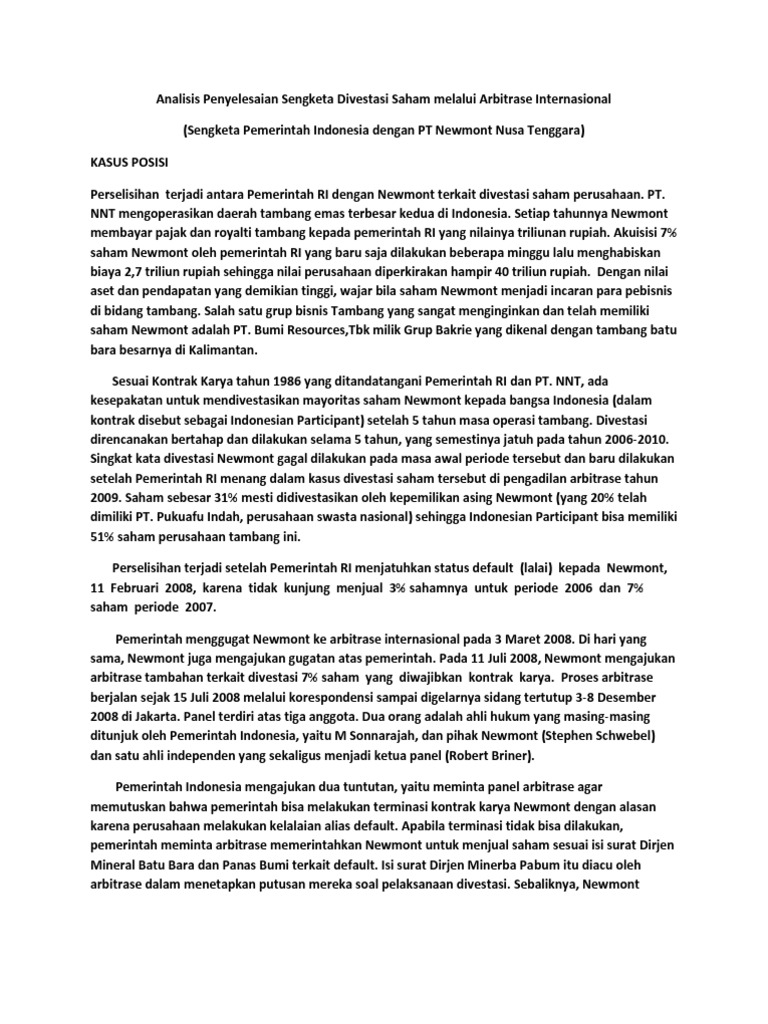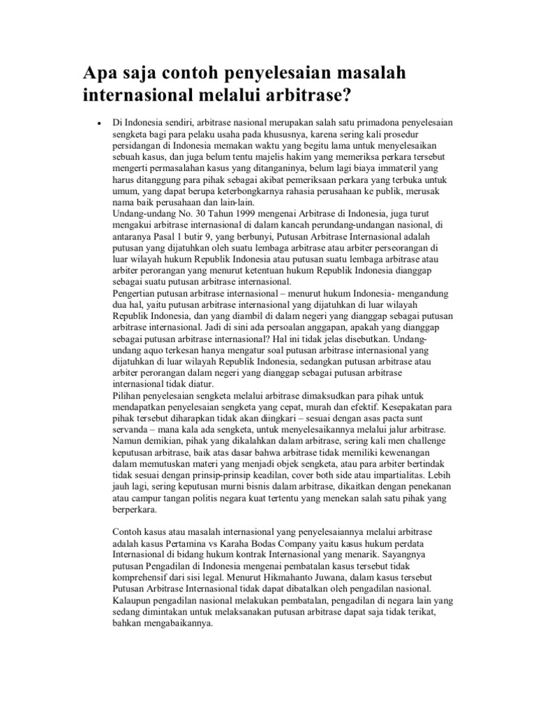 22 Contoh Kasus Penyelesaian Sengketa Bisnis Melalui Arbitrase. Ditulis Anonim Minggu, 25 November 2018 Tulis Komentar. Edit. Adapun dua hal utama terkait efektivitas ini meliputi efektivitas dari segi waktu dan biaya. Indonesia pernah melalui beragam kasus sengketa bisnis dengan pihak asing.