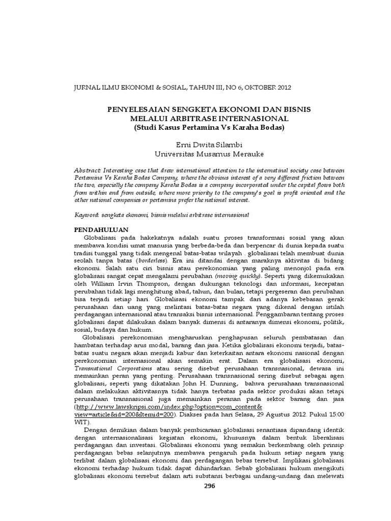 Silambi, Erni D. "Penyelesaian Sengketa Ekonomi dan Bisnis melalui Arbitrase Internasional (Studi Kasus Pertamina Vs Karaha Bodas)." Jurnal Ilmu Ekonomi & Sosial Unmus, vol. III, no. 6, 2012. Download citation file: