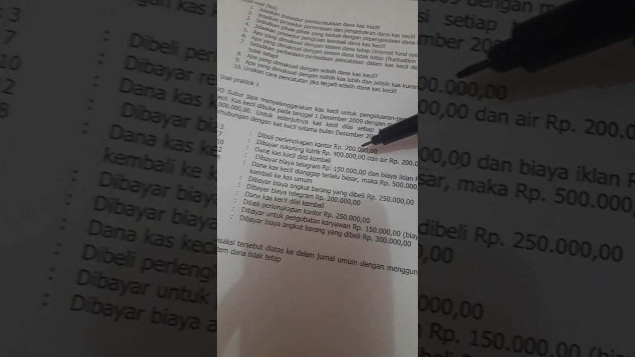 Contoh Soal dan Metode Pencatatan Kas Kecil. Istilah dana kas kecil (petty cash found) bisa di artikan sebagai sejumlah uang yang disiapkan/disediakan oleh suatu perusahaan yang berfungsi untuk membayarkan pengeluaran-pengeluaran yang jumlahnya tidak terlalu besar (relatif kecil) dan akan tidak ekonomis bila dibayarkan dengan menggunakan cek. Contoh soal pilihan ganda kas kecil dan jawabannya biasanya berkaitan dengan pengertian sistem dan metode yang digunakan mengelola kas kecil. Metode tetap imprest fund method untuk memenuhi pengeluaran rutin perusahaan pt sana sini membuat dana kas kecil pada tanggal 3 januari 2019 dengan menetapkan jumlah rp 225000. Contoh Soal Kas Kecil Metode Imprest | Sistem Dana Tetap. PT Mei Jaya bersama menetapkan kas kecil untuk pembayaran pengeluaran dalam nominal yang kecil. Kas kecil tersebut dimulai pada tanggal 1 januari 2019 dengan menerima uang sebesar Rp 3.500.000 dari akun kas. Kas kecil akan diisi kembali disetiap tanggal 15 dan tanggal 30.