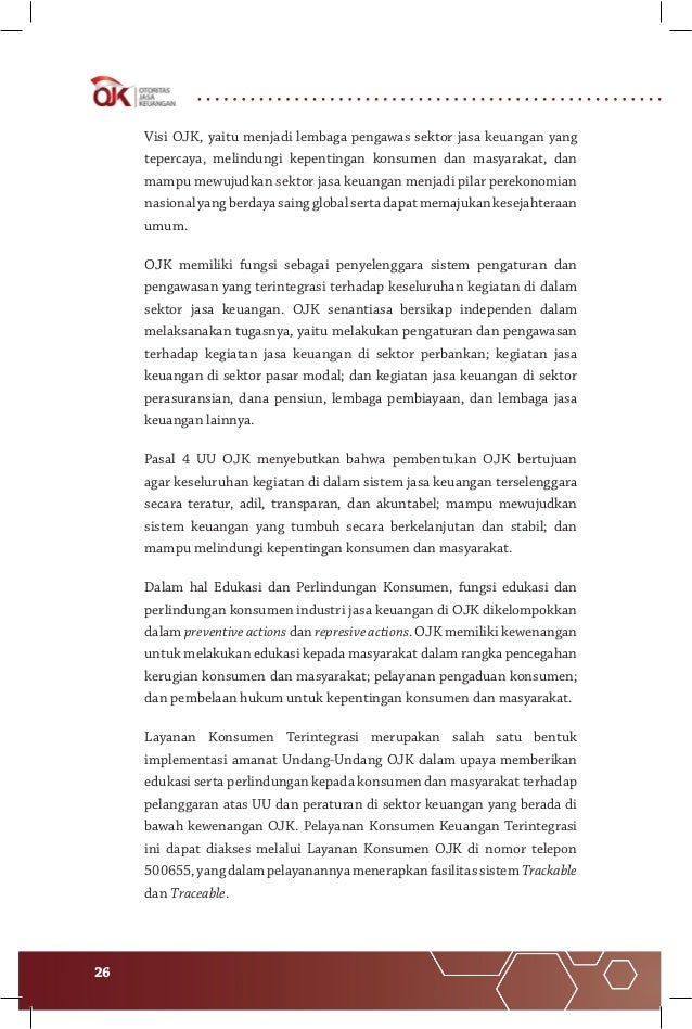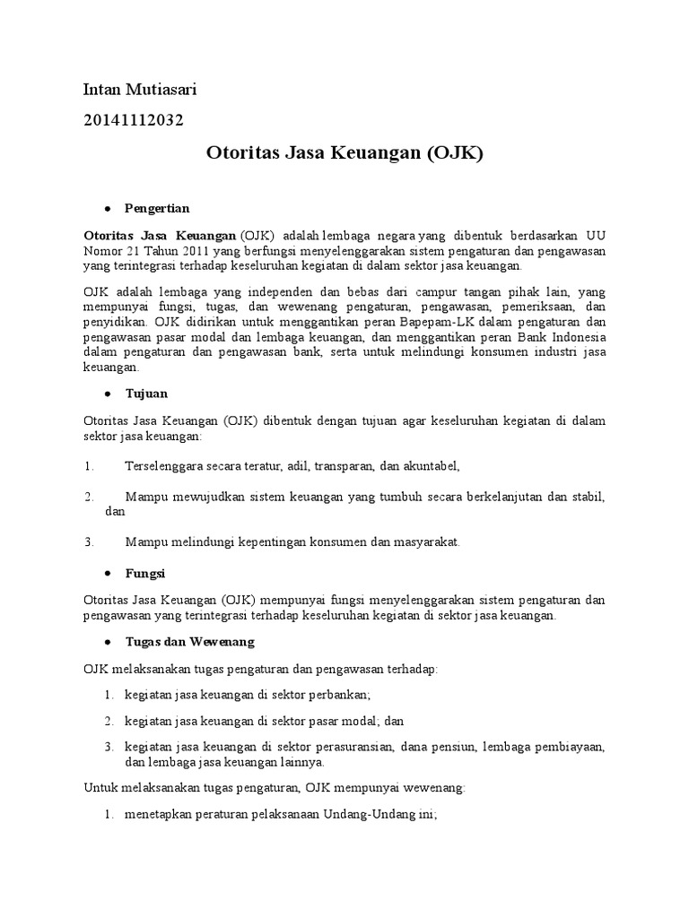Define OJK. berarti singkatan dari Otoritas Jasa Keuangan, yang merupakan lembaga yang ... yang mempunyai fungsi, tugas dan wewenang pengaturan, pengawasan, ... 20 Jan 2021 — ... dan penyelarasan fungsi dan kewenangan Bank Indonesia terkait perizinan, pengawasan, serta data dan/atau informasi yang terintegrasi.