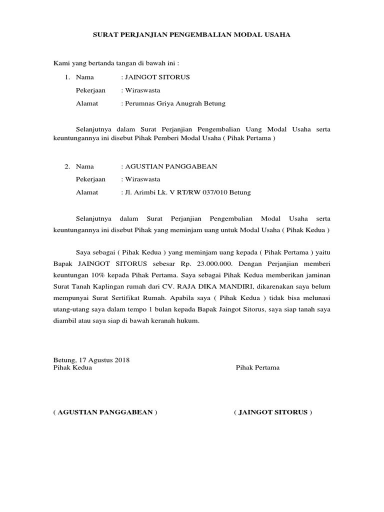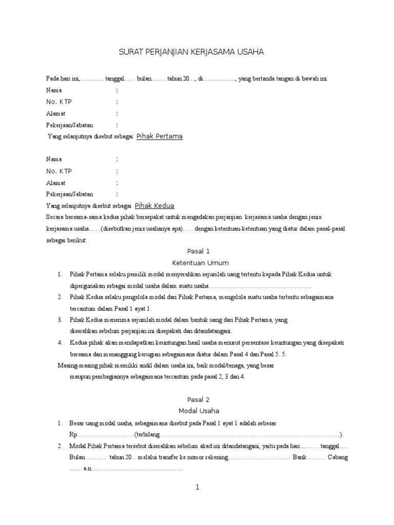 Contoh surat perjanjian kerjasama investasi modal usaha ini digunakan sebagai keterangan dan pengikat dua belah pihak yang melakukan kerjasama. 15000000 lima belas juta rupiah sebagai modal untuk menjalankan usaha penjualan hewan kurban yang akan dilaksanakan oleh pihak kedua dan pihak kedua dengan ini sepakat untuk meminjam uang tersebut dari ...