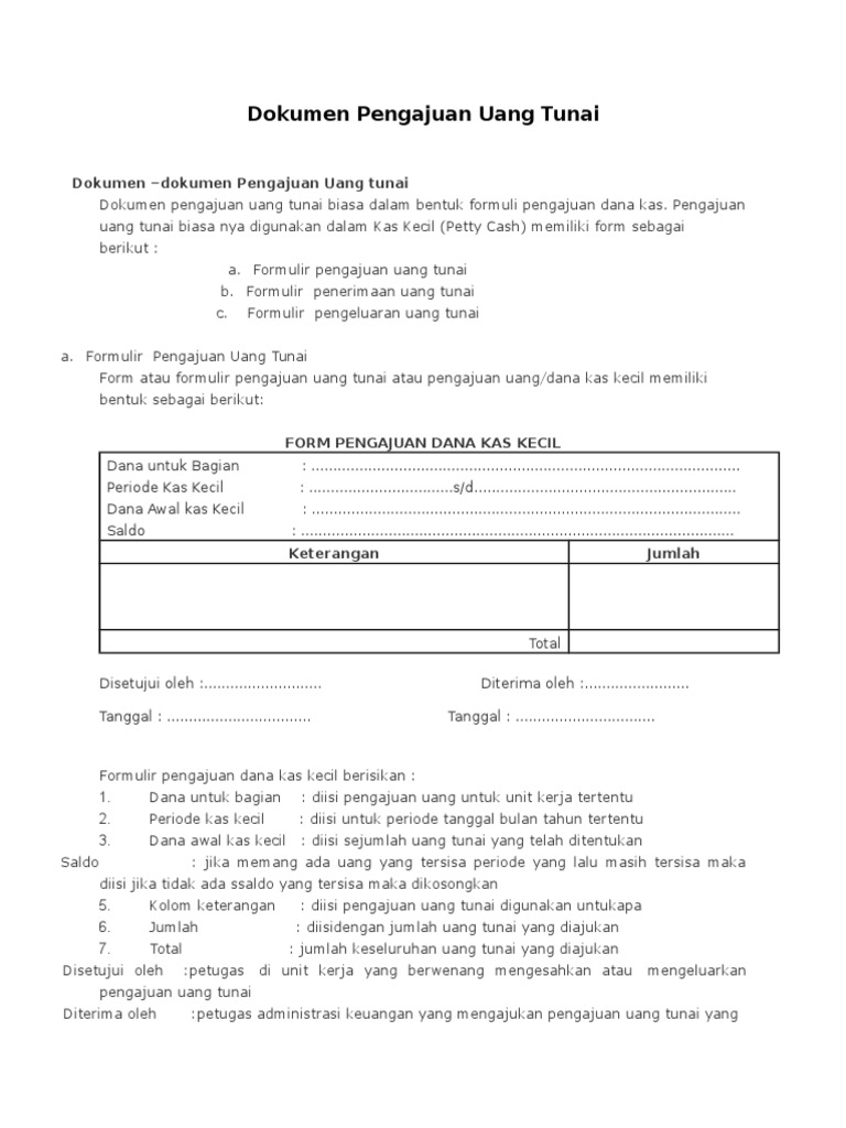 Format Pengajuan Dana kas kecil 1. 12 Contoh Kas Kecil Beserta Pembahasannya - Administrator Muda. Perusahaan perusahaan berharap untuk mendapatkan kualitas. Pengertian dan Jenis serta Kelebihan dan Kekurangannya. 5500000- Bagian Administrasi Total Rp. Dalam pengajuan Formulir form pengajuan dana kas kecil terdapat beberapa hal penting yang ...