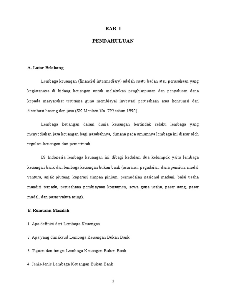 BAB I. PENDAHULUAN. A. Latar Belakang. Pada pokonya, Lembaga Keuangan Bukan Bank mempunyai kegiatan utama yang tidak jauh berbeda dengan bank. Secara umum, kegiatan utama Lembaga Keuangan Bukan Bank adalah menghimpun dana dari masyarakat dan menyalurkannya...