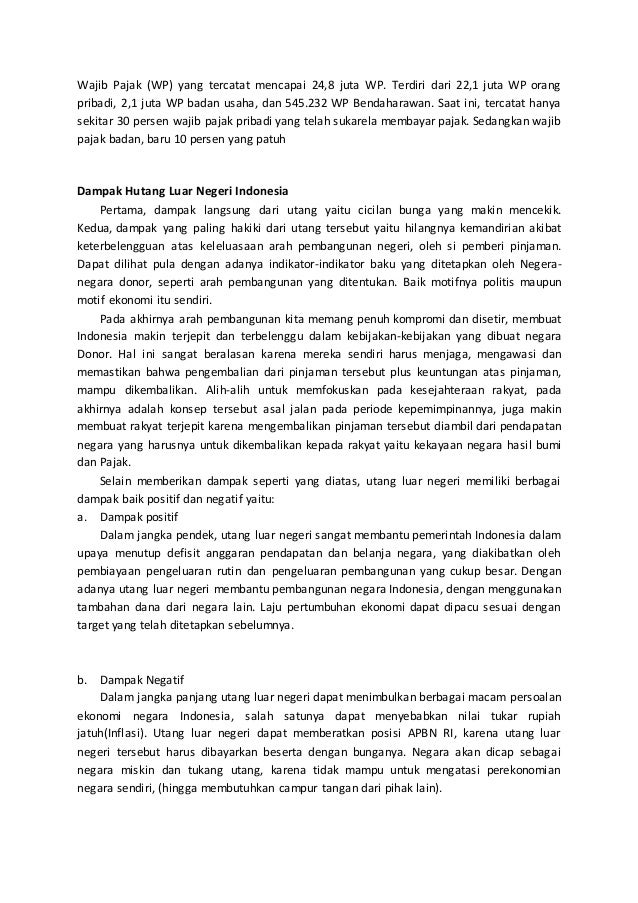 Dian Ediana Rae dan Sari Nadia Z Rizal. MASALAH pinjaman luar negeri Indonesia dianggap oleh banyak pihak telah sampai pada titik yang mengkhawatirkan. Hal ini terlihat dari munculnya kembali berbagai komentar mengenai masalah pinjaman luar negeri dalam berbagai kesempatan. Sebaliknya, pinjaman luar negeri mungkin kurang efektif apabila cenderung digunakan untuk konsumsi (Thirlwall dan Hussein 1982). 7 Selain itu, pinjaman luar negeri juga berpotensi meningkatkan pertumbuhan ekonomi apabila dialokasikan untuk meningkatkan teknologi yang... Adapun pinjaman dalam negeri (PDN) sendiri merupakan jenis pinjaman yang dilakukan oleh Pemerintah yang diperoleh dari lender dalam negeri, dalam hal ini yaitu BUMN atau Pemerintah Daerah (Pemda), yang harus dibayar kembali dengan persyaratan tertentu, sesuai dengan masa...
