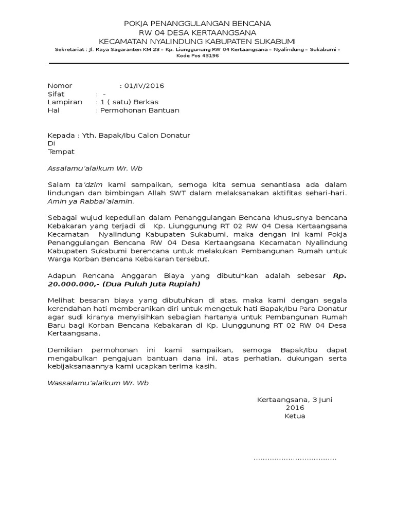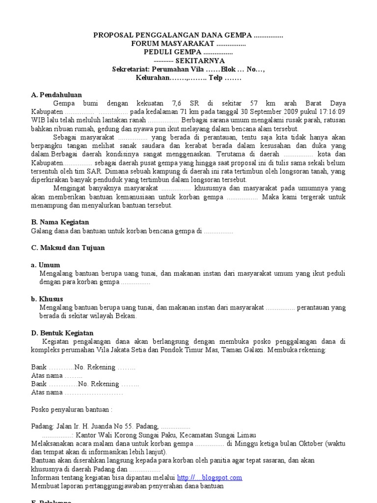 Contoh proposal penggalangan dana bencana alam. Potensi bencana alam yang mungkin terjadi adalah gempabumi, banjir, gerakan tanah, letusan gunungapi, kebakaran hutan dan lahan, sehingga diperlukan upaya ...131 pages Earthquake Post Emergency Assistance / Bantuan Darurat Pasca Gempa Bumi ... pengusaha yang mampu mengatur dan melaporkan dana serta.120 pages Mar 25, 2021 — Contoh proposal penggalangan dana dan bantuan bencana alam. Apalagi jika melibatkan tim besar yang membawahi banyak orang. Contoh proposal kegiatan 17 agustus di sekolah Contoh proposal pengajuan usaha makanan di mall Contoh proposal penggalangan dana bencana alam tsunami Contoh ...