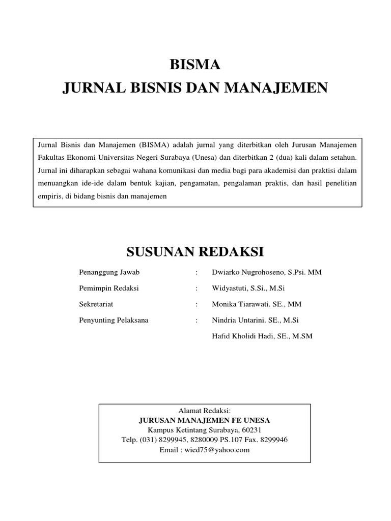 Jurnal bisnis dan manajemen. TEMPLATE JURNAL . TEMPLATE JURNAL . CURRENT INDEXING. MEMBERSHIP. ISSN BARCODE. ONLINE CITATION SCHOLAR. Information. For Readers For Authors For Librarians Akuntansi Bisnis dan Manajemen (ABM) - ISSN 0854-4190 | E-ISSN 2685-3965 ... BISMA (Bisnis dan Manajemen) is a peer-reviewed and open access platform focused on business, management, and entrepreneurship. The aim of BISMA is to be an authoritative source of information on its focuses. Since Volume 12 Issue 1 October 2019, BISMA (Bisnis dan Manajemen) has been published in English with an enhanced template. 27 Apr 2021 — Jurnal Manajemen Bisnis Published by the Center for Science Publishing , Faculty of Economics and business of Universitas Muslim Indonesia, ... Jurnal Bisnis, Manajemen & Perbankan is a peer-reviewed (double blind review) journal published by Management Study Program, Faculty of Economic and Business of Universitas Muhammadiyah Sidoarjo two times a year in March and September. The goal of this journal is to facilitate scholars, researchers, and lecturers for publishing the original research articles or review articles.