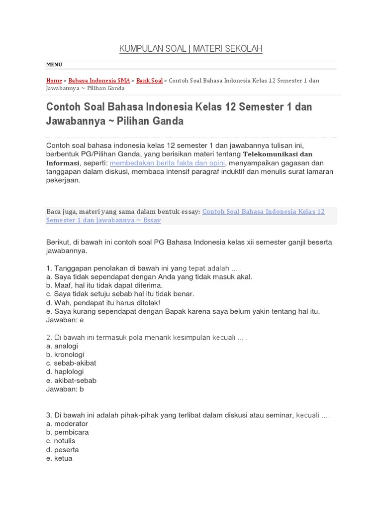 Homepage / BANK SOAL / Soal Bahasa Indonesia Kelas 12. Soal Bahasa Indonesia Kelas 12 Oleh admin Diposting pada 1 Juni 2021 9 Juni 2021 / soal semester ganjil 1. Daftar Isi Artikel. soal semester ganjil 1. Lowongan Kerja; Sebarkan ini: Posting terkait: