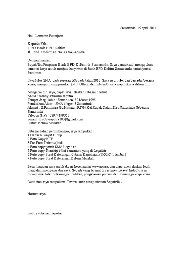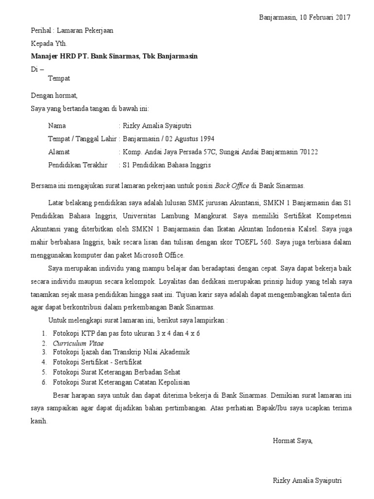 Contoh lamaran pekerjaan di bank