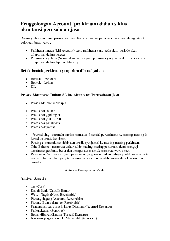 Kolom debit diisi dengan jumlah saldo akun yang bersaldo debit, begitu juga dengan kolom kredit. 4 Tahapan Dalam Pembuatan Neraca Saldo. Menyiapkan format lembar kerja Neraca saldo seperti pada gambar di atas. Perhatikan dan amati setiap akun yang dibuat pada buku besar yang telah dibuat pada periode berjalan. Buku besar akuntansi adalah wadah alat buku tempat pemindahan akun yang berasal dari jurnal bentuk buku besar diantaranya adalah bentuk T dan bentuk staffelskontro. Fungsi utama dari buku besar. Pindahkan jumlah debet dan jumlah kreditnya sekaligus ke dalam kolom debet dan kredit pada buku besar. Bentuk-bentuk buku besar antara lain. Pemindahan angka-angka dari dari jurnal ke buku besar (memindahkan jumlah angka dalam kolom debit atau kredit dari jurnal ke buku besar) disebut posting. Dalam melakukan posting buku besar, diutamakan asas berpasangan yang seimbang. Posting dari jurnal khusus dilakukan sebulan sekali yaitu setiap akhir bulan. Aturan Debit dan Kredit Dalam Akuntansi. 1. Akun Asset (Asset Account) Akun asset digunakan dalam menacatat semua transaksi yang berhubungan atau mempengaruhi perubahan (baik peningkatan atau penurunan) dalam asset. Pengaruh akun dalam asset ini adalah, apabila terjadi peningkatan asset (+) maka dicatat dalam kolom sebelah kiri yaitu kolom debet.