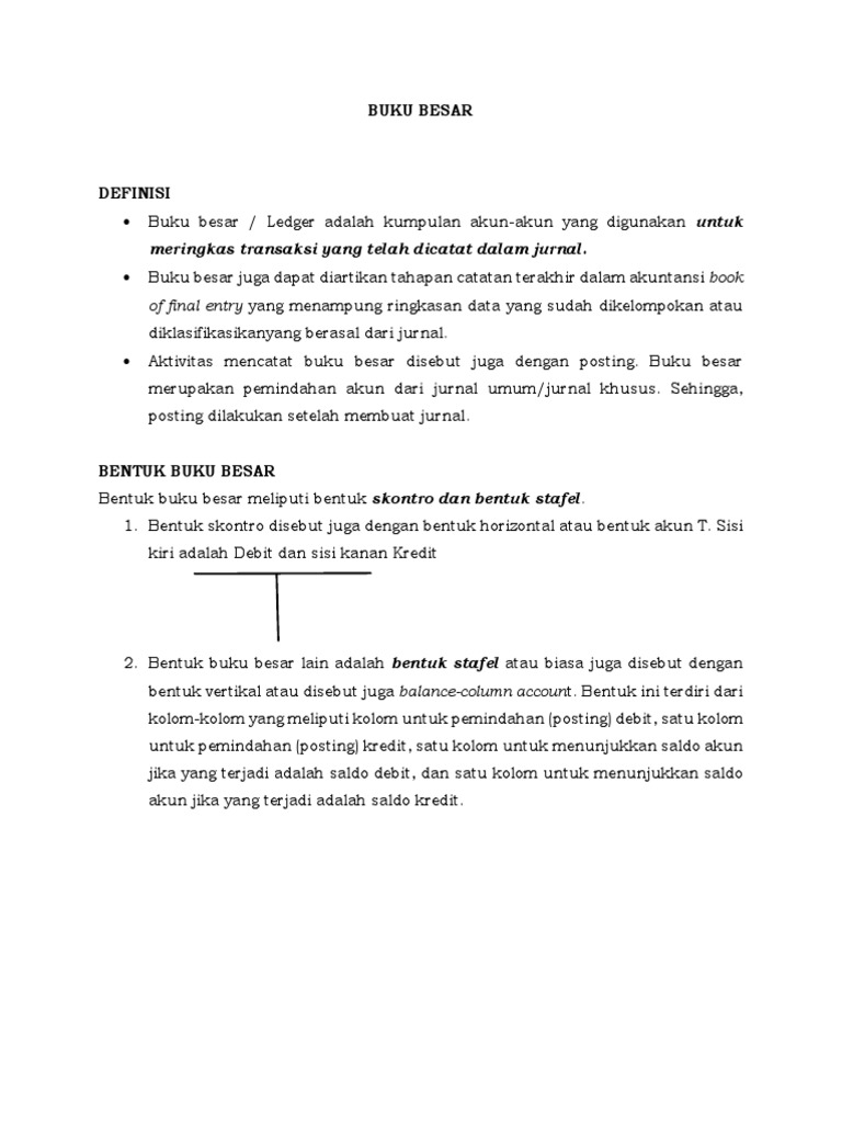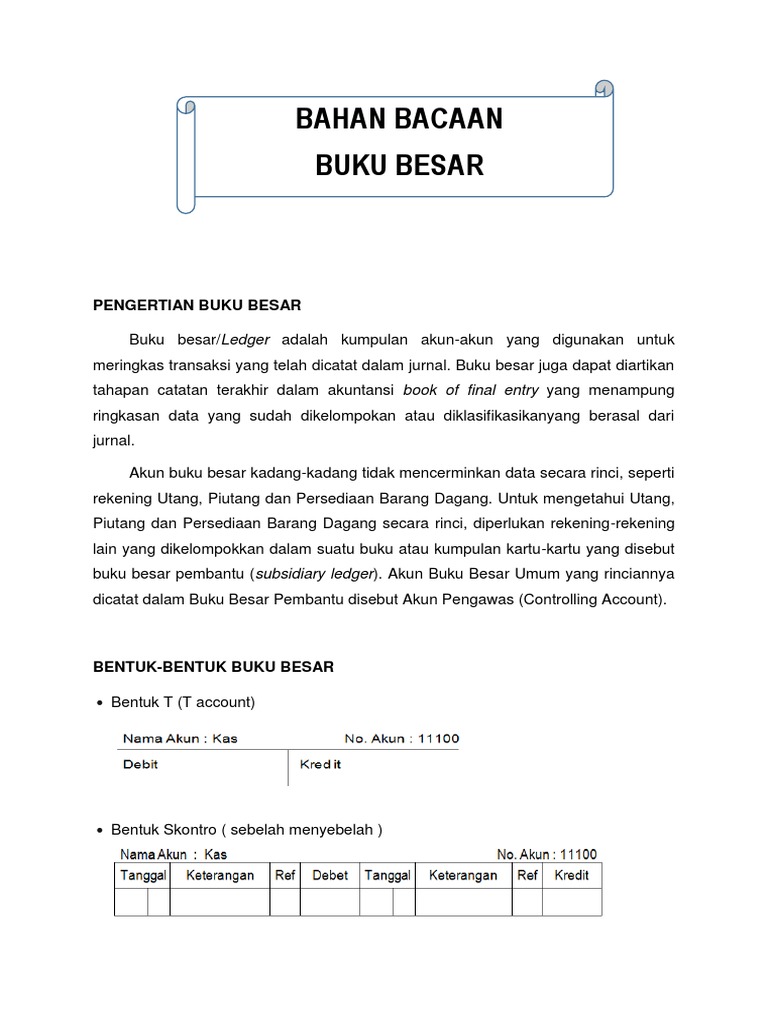 Dalam keadaan seperti ini buku besar diposting dari bukujurnal (secara periodik) dan buku pembantu diposting dari jurnal atau langsung dari dokumen (bukti) transaksi. 3 Apabila suatu rekening banyak sekali, misalnya piutang, maka dapat dibuatkan buku rekening kontrol dan masing-masing rekening kontrol ini dibuatkan buku pembantu. Buku besar ini berisi tentang perkiraan pengaruh adanya transaksi keuangan terhadap perubahan sejumlah akun. Akun tersebut adalah aktiva, kewajiban ataupun modal perusahaan. Buku besar akuntansi memfasilitasi semua pemindahan data entri jurnal dalam urutan kronologis ke rekening masing-masing. Jumlah buku besar yang diperlukan perusahaan ... Setelah dijumlahkan, hasil yang didapat dipindahkan ke dalam buku besar sesuai dengan perkiraan yang dipakai, baik itu di bagian sebelah debit maupun kredit. Hasil penjumlahan yang kini ada dalam buku besar perlu ditandai. Kolom "ref" di jurnal khusus diisi dengan tanda ceklis atau nomor kode perkiraan.