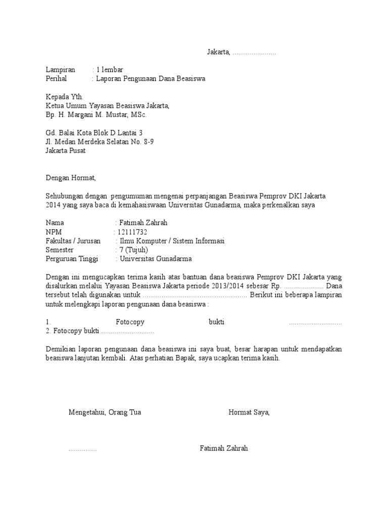 laporan penggunaan dana beasiswa isinya harus disesuaikan dengan dana yang telah anda terima dan gunakan. untuk versi yang pertama silakan klik >> versi 1 - Contoh Laporan Pengunaan Dana Beasiswa YBJ (Yayasan Beasiswa Jakarta)
