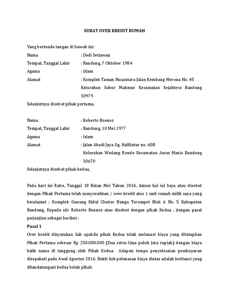 Aug 29, 2021 · Surat perjanjian over kredit motor adalah surat pernyataan terkait proses kredit telah diambil alih oleh pihak kedua di mana pihak pertama tidak lagi melakukan proses kredit dan tidak bertanggung jawab lagi atas barang yang dikreditkan karena sudah milik pihak kedua. Surat perjanjian over kredit ini penting dibuat, apalagi bila over kredit kepada pihak leasing. Aug 05, 2021 · Contoh Surat Perjanjian Over Kredit Motor – Sebisa mungkin anda harus mencantumkan informasi yang jelas dan sedetail mungkin. Demikian mengenai contoh surat over kredit motor dengan berbagai jenis merek yang dapat menjadi refensi untuk membuat surat over kredit yang benar dan resmi agar aman dalam melakukan over kredit.