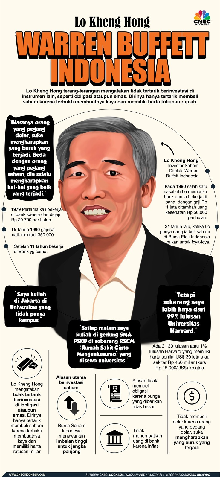 5 Tips Sukses Jadi Investor Saham ala Lo Kheng Hong. Jakarta: Dunia investasi saham tidak asing dengan sosok Lo Kheng Hong yang dijuluki Warren Buffett Indonesia. Ia telah malang melintang di dunia investasi dan mengecap asam garam 32 tahun dalam berinvestasi di pasar modal. Serta melewati berbagai kondisi ekonomi Tanah Air.
