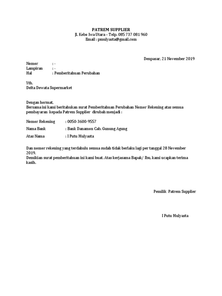 Contoh Surat Pemberitahuan Nomor Rekening Bank Perusahaan Temukan informasi lengkap tentang Contoh Surat Pemberitahuan Nomor Rekening Bank Perusahaan. Surat Penarikan Depo... Contoh Surat Perubahan Nomor Rekening Bank - Berbagi Contoh... Surat pemberitahuan perubahan nomor rekening bank perusahaan nomor rekening bank milik pribadi atau perusahaan bisa saja mengalami pergantian. Contoh surat pemberitahuan perubahan nomor rekening bank format profesional sebagai referensi yang baik dalam membuat surat... Contoh Surat Permohonan Ganti Nama Rekening Bank Demikian contoh surat pemberitahuan perubahan nomor rekening dengan format profesional yang baik. Permohonan itu bisa berupa dana izin Surat Pernyataan Perubahan Nama Perusahaan. Prosedur Withdrawal Bank Lokal. 30 Contoh Surat Kuasa Lengkap Pengertian Jenis Dan Ciri. Contoh Surat Pemberitahuan Sesuai Kaidah dan Cara Membuatnya Contoh surat pemberitahuan, misalnya, pemberitahuan gugatan, pemberitahuan kegiatan, pemberitahuan tunggakan kredit, hingga pemberitahuan Dengan surat pemberitahuan ini, kami menyampaikan bahwa perusahaan akan menggelar acara gathering tahunan bersama jajaran direksi.