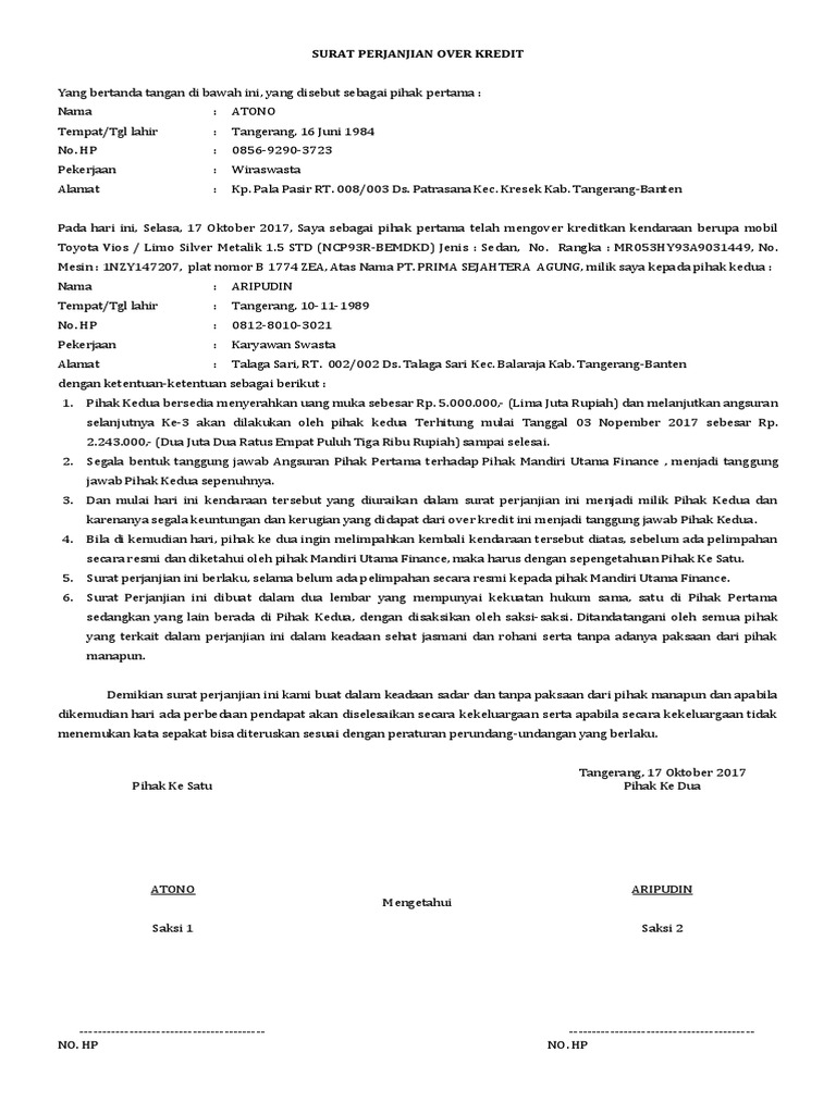 Pada hari ini, Senin, 23 MEI 2016, Saya sebagai pihak pertama telah mengover kreditkan kendaraan berupa mobil Honda Jazz Matic warna Merah dengan plat nomor D 5555 ZZ milik saya kepada pihak kedua: Nama : Roy Atmaja. Tempat/Tgl lahir : Jakarta, 5 Mei 1970. Pekerjaan : Karyawan Swasta. Alamat : Jalan Pabelit No. 30 Rt. 01/ Rw. 01 Bandung 60790
