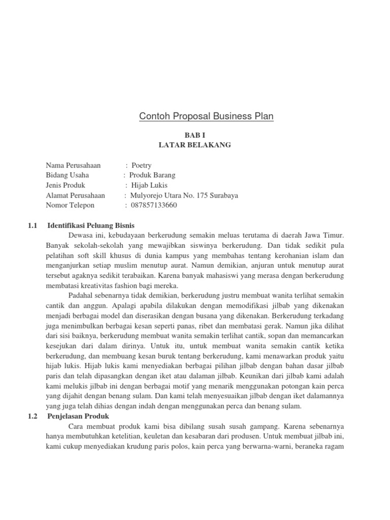 › CONTOH_PROPOSAL_BUSINESS_PLAN(DOC) CONTOH PROPOSAL BUSINESS PLAN | malik hemek - Academia.edu NAMA : HILDA KURNIA SETIAJI NIM :30401411271 CONTOH PROPOSAL BUSINESS PLAN BAB I PENDAHULUAN Nama Perusahaan : Corp. Bidang Usaha : Produk Makanan Jenis Produk : Nugget Tahu Alamat Perusahaan : Jalan Pemuda I, Rawamangun-Jakarta Timur Nomor Telepon : 083895161xxx A. Identifikasi Peluang Bisnis Dewasa ini, bisnis kuliner menjadi salah satu bentuk bisnis yang menjanjikan. Contoh proposal-business-plan - SlideShare Contoh proposal-business-plan 1. Rencana Bisnis [Nama Perusahaan] [BIDANG USAHA] [tempat dan tanggal penyusunan] disusun oleh: [Nama Penyusun] [Jabatan Penyusun] [Alamat Lengkap Perusahaan] No. Telepon [Nomor Telepon] No. Fax [Nomor Fax] Alamat E-mail [Alamat E-mail] Situs Web [Situs Web] contoh-proposal-business-plan-130413042137-phpapp01.doc − 1