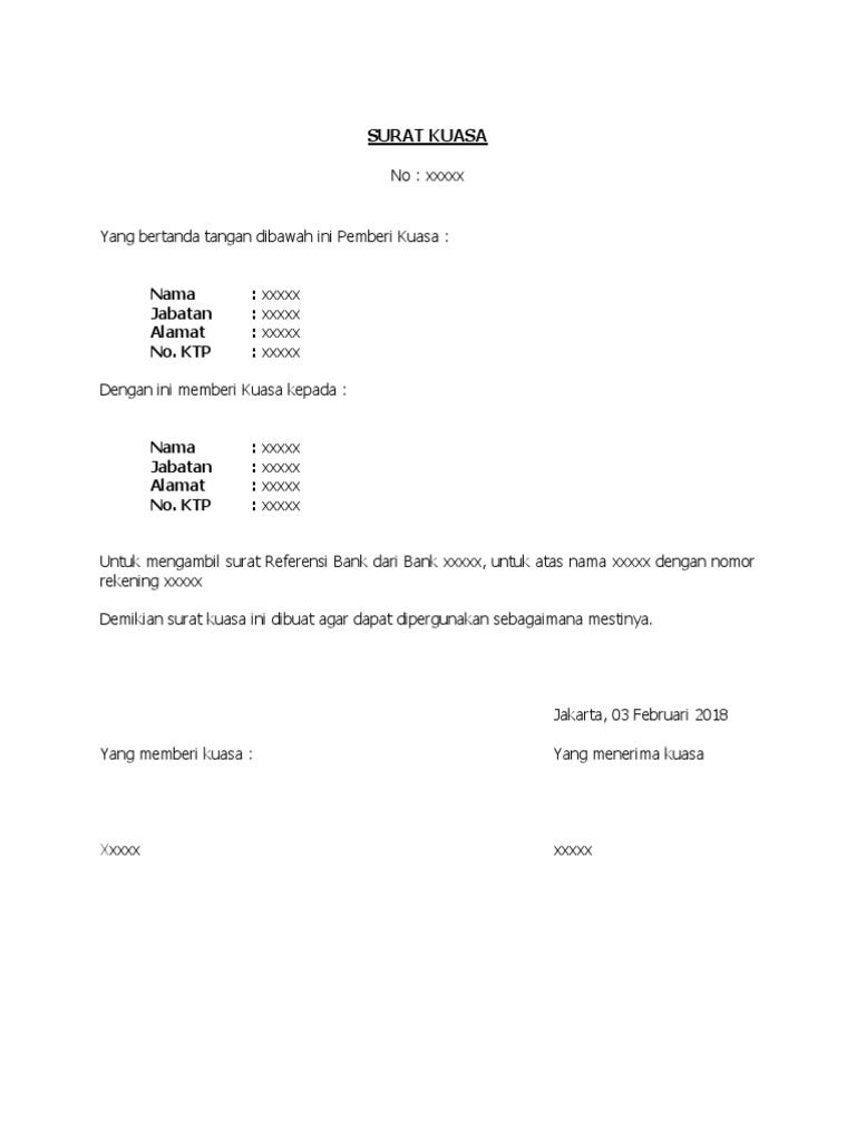 Untuk membuat contoh surat permohonan referensi bank BCA Bank Central Asia jangan lupa untuk menuliskan data secara detail baik nomor rekening nama pemilik rekening pekerjaan serta ditujukan kepada alamat kantor cabang BCA mana yang hendak dituju. Termasuk persyaratan yang harus dipenuhi. 3674035902890001 Alamat di KTP. Anda pun harus menulis surat kuasa bank dengan baik, karena bukan tidak mungkin kalau pihak bank akan menolak surat kuasa yang terkesan alakadarnya/ Maka dari itu, di bawah ini adalah beberapa contoh surat kuasa bank yang bisa anda pergunakan sebagai bahan referensi. 1. Contoh Surat Kuasa Pengambilan Uang di Bank. Daftar Berbagai Nomor Referensi Bank di Indonesia. Karena setiap bank memiliki nomor referensinya masing-masing, kalian terlebih dahulu harus mengetahui berapa kode referensi rekening tujuan. Anda harus memperhatikan hal ini karena nantinya jika salah, maka transaksi tidak akan berhasil karena nomor rekeningnya tidak akan terbaca sistem.