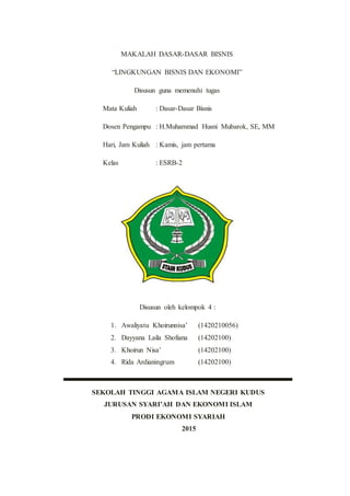 Makalah lingkungan bisnis Makalah lingkungan bisnis. I. pendahuluan. Dalam menghadapi persaingan dalam dunia bisnis diperlukan suatu strategi yang tepat guna RUMUSAN MASALAH. · Apa definisi lingkungan bisnis? · Bagaimana analisis terhadap lingkungan umum? · Apa pengaruh lima kekuatan terhadap...