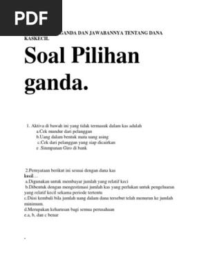 40 Soal Akuntansi Kecamatan dan Desa Beserta Jawaban ... 39. Dokumen manakah di bawah ini yang merupakan titik awal bagi Anda untuk mencari tahu ketika Dewan sedang mempersiapkan kebijakan perencanaan mengenai tempat tertentu atau isu dan pada tahap apa itu di dalam proses persiapan.... a. Skema pembangunan daerah b. Dokumen rencana pembangunan c. Dokumen perencanaan pelengkap d. Soal Pilihan Ganda Dan Jawabannya Tentang Dana Kas Kecil ... SOAL PILIHAN GANDA DAN JAWABANNYA TENTANG DANA KAS KECIL Soal Pilihan ganda. 1.Aktiva di bawah ini yang tidak termasuk dalam kas adalah … . a.Cek mundur dari pelanggan. b.Uang dalam bentuk mata uang asing c.Cek dari pelanggan yang siap dicairkan d.Kas kecil e.Simpanan Giro di bank 2.Pernyataan berikut ini sesuai dengan dana kas kecil… . a.Digunakan untuk membayar jumlah yang relatif kecil ...