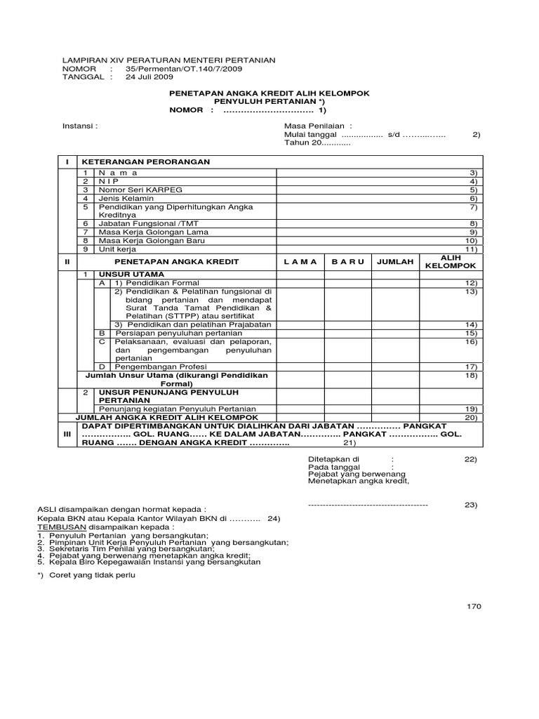 40 form angka kredit penyuluh pertanian - Info Investasi Penyuluh Pertanian Terampil yang akan beralih menjadi Penyuluh Pertanian Ahli diberikan angka kredit dari ijazah S1/D.IV ditambah angka kredit kumulatif sebesar 65% dari pendidikan dan pelatihan, tugas pokok dan pengembangan profesi dengan tidak memperhitungkan angka kredit dari unsur penunjang. Baca Juga : PERMENPAN 35 Tahun 2014 Tentang ...