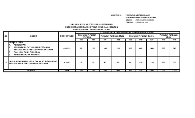 Jabatan Fungsional Penyuluh Pertanian Dan Angka Kreditnya Penyuluh Pertanian Terampil yang akan beralih menjadi Penyuluh Pertanian Ahli diberikan angka kredit dari ijazah S1/D.IV ditambah angka kredit kumulatif sebesar 65% dari pendidikan dan pelatihan, tugas pokok dan pengembangan profesi dengan tidak memperhitungkan angka kredit dari unsur penunjang. Baca Juga : Download Permenpan 41 Tahun 2012. Angka Kredit (DUPAK) - Jabatan Fungsional Angka Kredit (DUPAK) Angka Kredit adalah satuan nilai dari tiap butir kegiatan dan/atau akumulasi nilai butir-butir kegiatan yang harus dicapai oleh seorang fungsional tertentu dalam rangka pembinaan karier kepangkatan dan jabatannya. Berikut daftar jabatan fungsional tertentu beserta penjelasan. Download Contoh Format PAK dan DUPAK ... - Salam Edukasi Penilaian dan penetapan angka kredit Guru dilakukan paling sedikit 1 (satu) kali dalam setahun. Penilaian dan penetapan angka kredit untuk kenaikan pangkat Guru dilakukan 2 (dua) kali dalam 1 (satu) tahun, yaitu 3 (tiga) bulan sebelum periode kenaikan pangkat Pegawai Negeri Sipil sebagai berikut: a. Permen PAN & RB No. 35 Tahun 2020 tentang Jabatan ... CATATAN: Peraturan Menteri Pendayagunaan Aparatur Negara dan Reformasi Birokrasi ini mulai berlaku pada tanggal 29 Mei 2020. Mencabut Peraturan Menteri Negara Pendayagunaan Aparatur Negara Nomor: PER/02/MENPAN/2/2008 tentang Jabatan Fungsional Penyuluh Pertanian dan Angka Kreditnya. 73 halaman dengan lampiran.