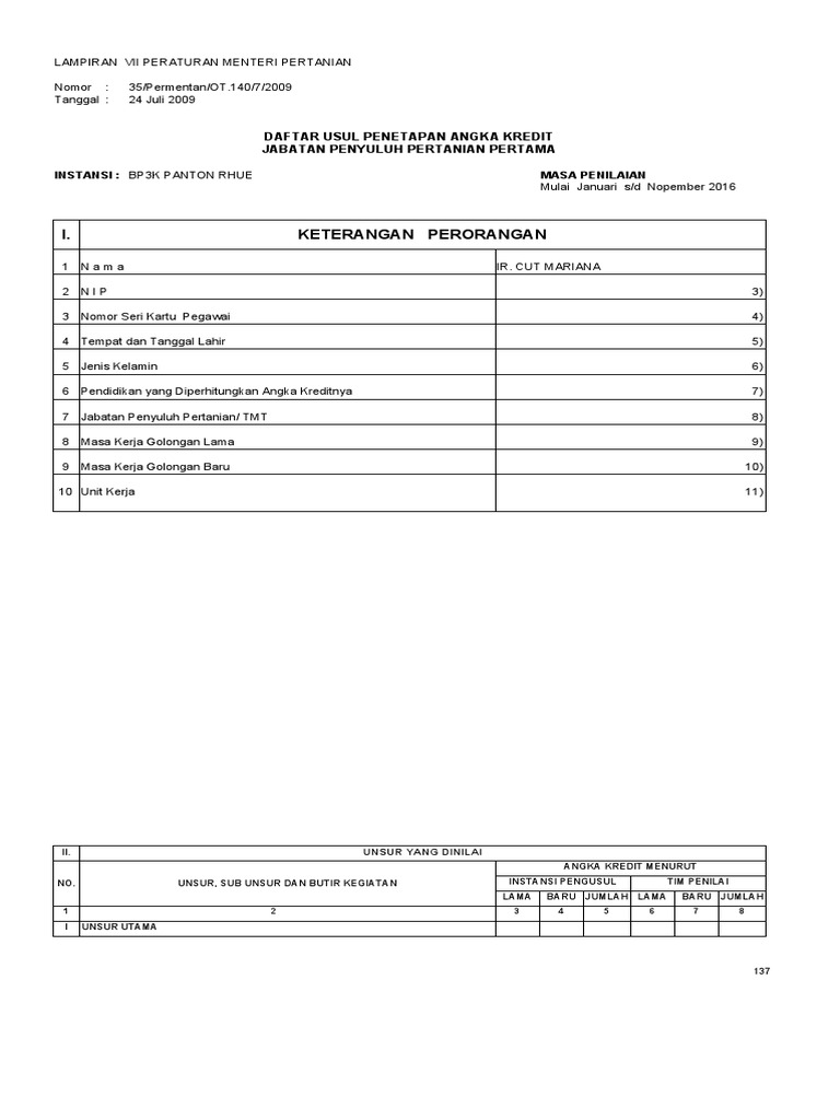 40 form angka kredit penyuluh pertanian - Info Investasi Penyuluh Pertanian Terampil yang akan beralih menjadi Penyuluh Pertanian Ahli diberikan angka kredit dari ijazah S1/D.IV ditambah angka kredit kumulatif sebesar 65% dari pendidikan dan pelatihan, tugas pokok dan pengembangan profesi dengan tidak memperhitungkan angka kredit dari unsur penunjang. Baca Juga : PERMENPAN 35 Tahun 2014 Tentang ... PDF Pusat Data dan Sistem Informasi Pertanian Penyuluh Pertanian Medik Veteriner Pengendali OPT Pengawas Bibit Ternak Pengawas Mutu Pakan Pengawas Benih Tanaman ... •Mencetak Form DUPAK •Mengunggah Scan Form DUPAK yang sudah ditandatangani ... Jenjang Jabatan Angka Kredit Minimal* Angka Kredit Maksimal (200%) * Pemula 3,75 7,5 Terampil 5 10 Mahir 12,5 25 PDF Peraturan Menteri Pertanian Republik Indonesia Jabatan ... 11. Penetapan Angka Kredit yang selanjutnya disingkat PAK adalah formulir yang berisi keterangan perorangan pejabat fungsional dan satuan nilai dari hasil penilaian butir kegiatan dan/atau akumulasi nilai butir-butir kegiatan yang telah dicapai oleh pejabat fungsional dan telah ditetapkan oleh pejabat penetap angka kredit. 12.