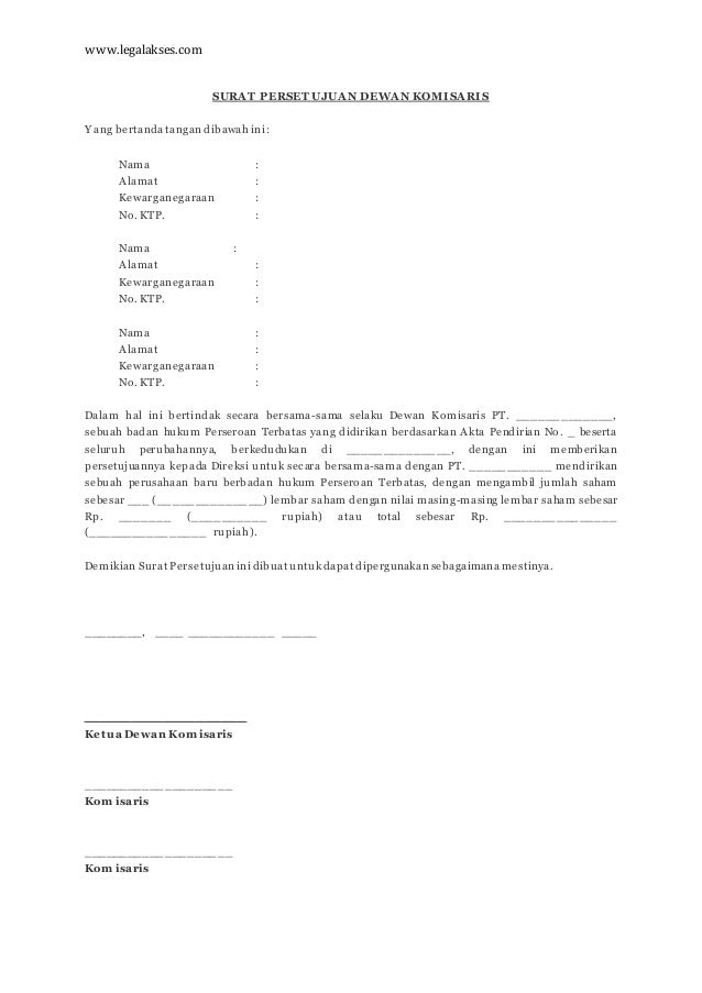 Contoh Surat Persetujuan Dewan Komisaris Untuk Mendirikan ... Dengan ini memberikan persetujuan kepada Direksi PT. _____ untuk mendirikan sebuah perseroan baru bersama dengan PT. _____ yang berbentuk badan hukum Perseroan Terbatas di _____ dengan nama PT. _____. Adapun komposisi pemegang saham perseroan baru PT. _____ tersebut adalah sebagai berikut: ... Contoh Surat Persetujuan Dewan Komisaris Untuk ... Diduga Terdakwa H. Tadjuddin Ius dan Nur Kholik, " Telah ... "Foto itu adalah foto saat tanda tangan pendirian perusahaan PT. KMA. Itu bukan foto penandatanganan Surat Persetujuan Dewan Komisaris untuk persetujuan pengajuan kredit," bantah Saepudin. Karena terdakwa Tajuddin Ius ngotot mengatakan bahwa foto itu adalah foto persetujuan saksi untuk pengajuan kredit itu, Ketua Majelis Hakim menegur terdakwa. Surat Persetujuan Komisaris / Surat Persetujuan Komisaris Pemberian persetujuan oleh dewan komisaris ini adalah dalam rangka menjalankan tugasnya untuk melakukan pengawasan kepada direksi dalam melakukan perbuatan hukum tertentu. 30/04/2021 lembar pengesahan/legalization ditetapkan oleh/ stipulated by: Tkit tpq baitul aini contoh format persetujuan warga format 1131 x 1600. 1 surat keputusan dewan ... 12+ Contoh Surat Bisnis; Konfirmasi, Perjanjian Kredit ... Demikian yang dapat saya bagikan mengenai contoh surat perusahaan; contoh surat konfirmasi, contoh surat perjanjian kredit investasi, contoh surat laporan audit, dan contoh surat laporan akuntan. Dan untuk contoh surat pribadi, contohnya surat lamaran pekerjaan, silahkan ke contoh surat lamaran kerja. Semoga bermanfaat. Terima kasih.