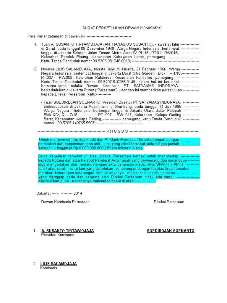 43 surat persetujuan komisaris untuk kredit - Kelola Dana Anda Persetujuan untuk menandatangani Perjanjian Kredit, Akta Pengakuan Hutang, Surat Kuasa Memasang Hak Tanggungan dan Akta Kuasa Untuk Menjual atas tanah (dan bangunan) sebagai jaminan, maka Surat Persetujuan harus ditandatangani di hadapan Notaris (tandatangan dilegalisir oleh Notaris). D. SURAT PERNYATAAN. 1. SURAT PERSETUJUAN KREDIT BISA UNTUK JAMINAN DANA TALANGAN.