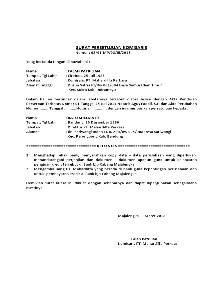 Surat persetujuan komisaris untuk kredit