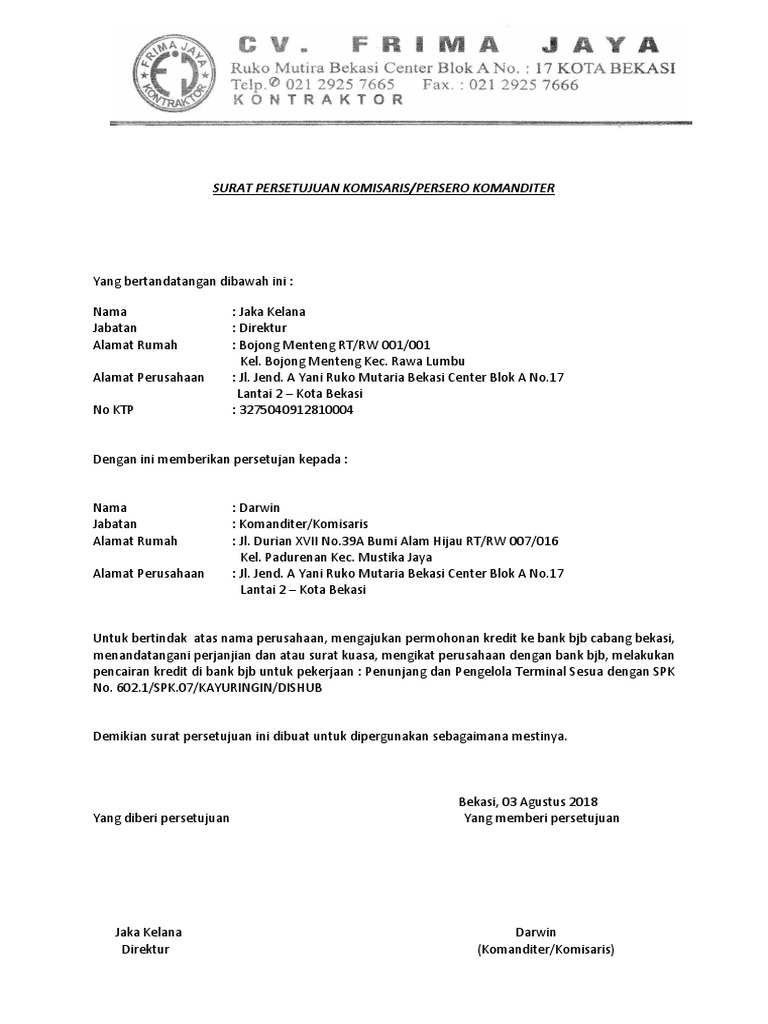 Format Surat Terbaru Contoh Surat Persetujuan Pinjaman ... surat persetujuan komisaris menjaminkan aset perusahaan. 214, cibinong bogor — bertempat tinggal di jl. Silahkan disimak contoh surat permohonan kredit bank berikut. Dengan ini memberikan persetujuan kepada direksi perseroan dan/atau kuasa yang ditunjuk oleh direksi,untuk dan atas nama perseroan. Berikut dikongsikan contoh surat meliputi surat pengesahan jawatan buat panduan semua.…