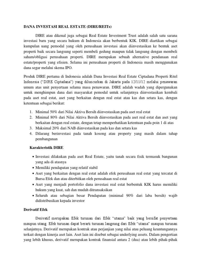 Dana Investasi Real Estate (DIRE) sebagai alternatif ... - Medium Melalui DIRE, investor dapat melakukan investasi di bidang real estate tanpa harus memiliki aset real estate secara langsung. Bagi investor, bentuk DIRE memiliki berbagai keuntungan. Keuntungan ... PDF Dana Investasi Real Estate (DIRE) Dana Investasi Real Estat berbentuk Kontrak Investasi Kolektif dilarang meminjam dana melalui penerbitan Efek bersifat utang namun dapat meminjam dana tanpa penerbitan Efek bersifat utang untuk kepentingan pembelian aset Real Estat dengan total nilai paling banyak20 % (dua puluh persen)dari total nilai aset Real Estat yang akan dibeli.