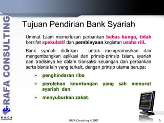 Prinsip Syariah - Perbankan Islam Prinsip Syariah di dalam Perbankan Islam Perbankan Islam mempunyai tujuan yang sama dengan perbankan konvensional melainkan operasinya adalah berlandaskan prinsip Syariah, yang dikenali sebagai Fiqh al-Muamalat (peraturan-peraturan Islam di dalam urus niaga). Prinsip dasar perbankan Islam ialah perkongsian untung dan rugi dan larangan ke atas riba' (faedah).