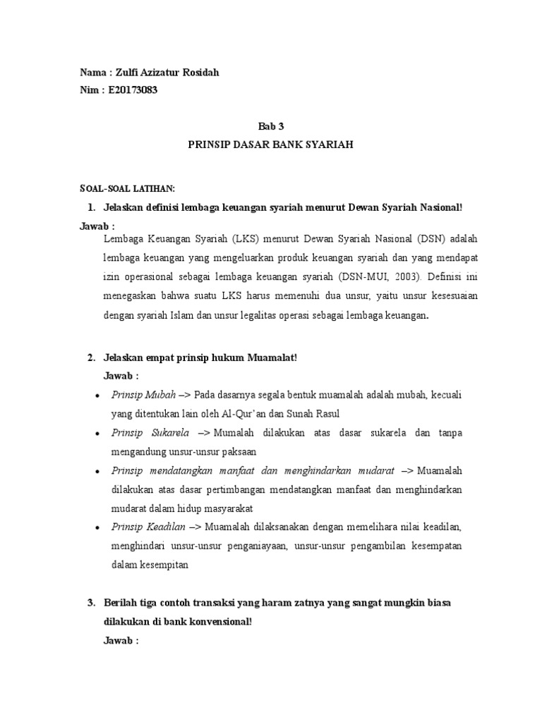 Bank Syariah: Definisi, Prinsip, dan Sistem Pengawasannya ... Di Indonesia, prinsip syariah yang berlaku di bank di antaranya: bagi hasil (mudharabah) penyertaan modal (musyarakah) jual-beli barang dengan memperoleh keuntungan (murabahah) pemberian modal untuk membeli barang, lalu barang disewakan kepada pihak tertentu, tanpa pergantian kepemilikan (ijarah) Prinsip-Prinsip Bank Syariah - MoneyTotem Prinsip Bank Syariah 1. Mudharabah Adalah suatu bentuk kerjasama usaha antaa mudharib (pengelola dana) dengan mudharib (pengelola dana) dengan nisab bagi hasil antara keduanya yang telah ditetapkan berdasarkan kesepakatan diawal. Biasanya jika terjadi kesalahan atau kebangkrutan, seluruh kerugian akan ditetapkan kepada pemilik usaha. Materi_1_-_Prinsip_Dasar_Bank_Syariah.pptx - Prinsip Dasar ... Prinsip Dasar Bank Syariah Lembaga Keuangan Syariah (LKS) menurut DSN adalah lembaga keuangan yang mengeluarkan produk keuangan syariah dan yang mendapatkan izin operasional sebagai lembaga keuangan syariah (DSN)-MUI, 2003). Prinsip Dasar Perbankan Syariah - DocShare.tips Prinsip-prinsip yang mendasari ekonomi Islam dibedakan atas sejumlah prinsip seperti: 1. Tauhid 2. Maslahah dan Falah 3. Khalifah (Wakil Allah di muka bumi) 4. Al amwal (Harta) 5. Adl (Adil) 6. Ukhuwah (Persaudaraan) 7. Akhlak (Etika) 8. Ulil amri (Pemerintah) 9. Hurriyah dan Mas'uliyah (Kebebasan dan Tanggung Jawab) 10.