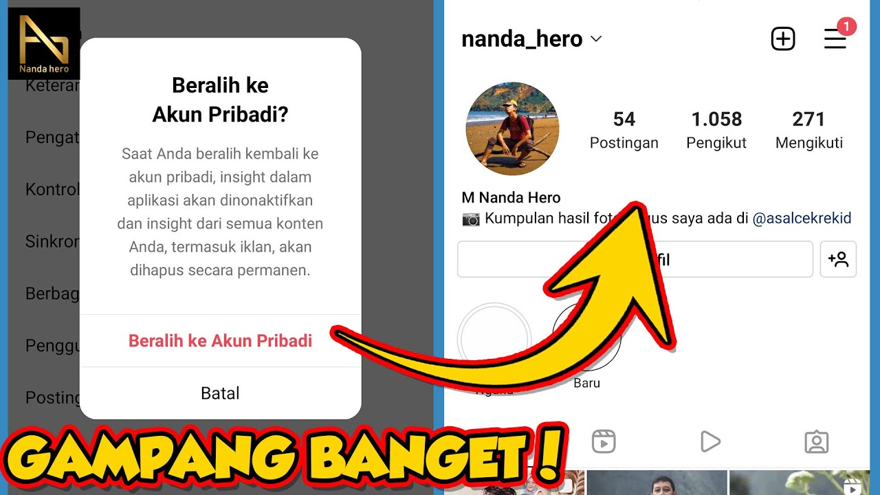 Cara Mengubah Akun Instagram dari Pribadi menjadi Instagram Bisnis Meskipun sudah diubah menjadi akun bisnis, Anda juga bisa mengembalikan akun Instagram tersebut menjadi akun personal lagi. Caranya, masuk ke Pengaturan (icon tiga titik di sebelah kanan atas), scroll ke bawah, pilih 'Beralih Kembali ke Akun Pribadi'.