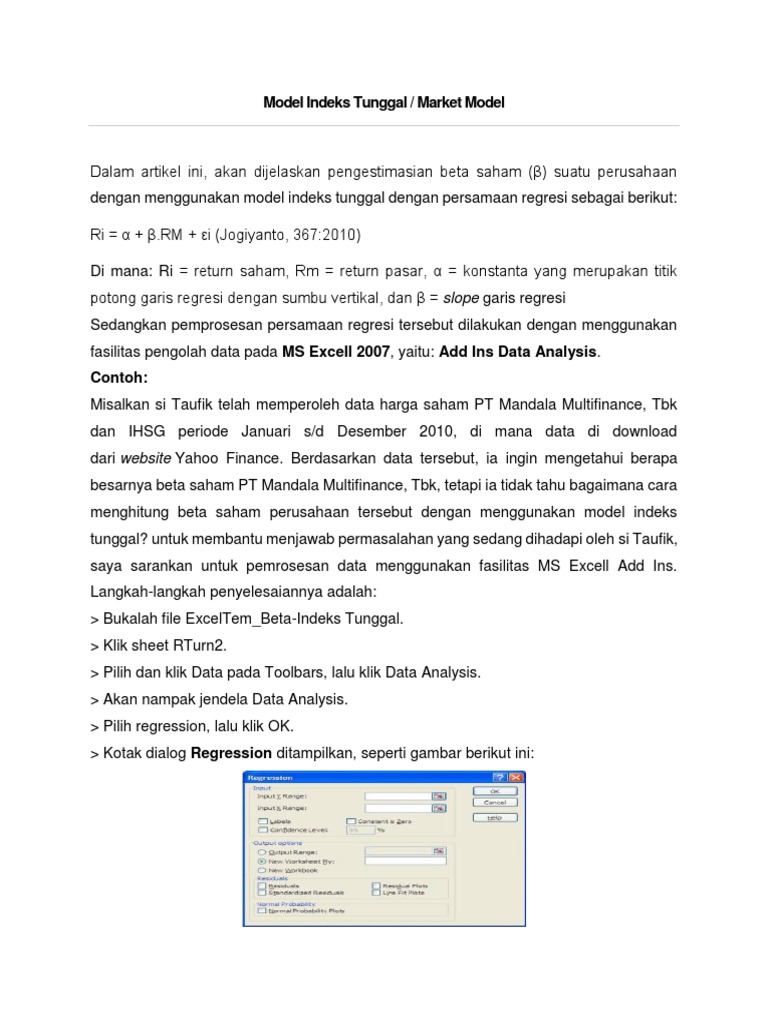 Cara Menghitung Beta Saham dengan Menggunakan Teknik Regresi... Dalam artikel ini, akan dijelaskan pengestimasian beta saham (β) suatu perusahaan dengan Berdasarkan hasil pemrosesan dengan MS Excel Add-Ins Data-Analysis, model regresi linear dapat Demikian uraian singkat dari saya tentang cara menghitung beta saham dengan menggunakan...