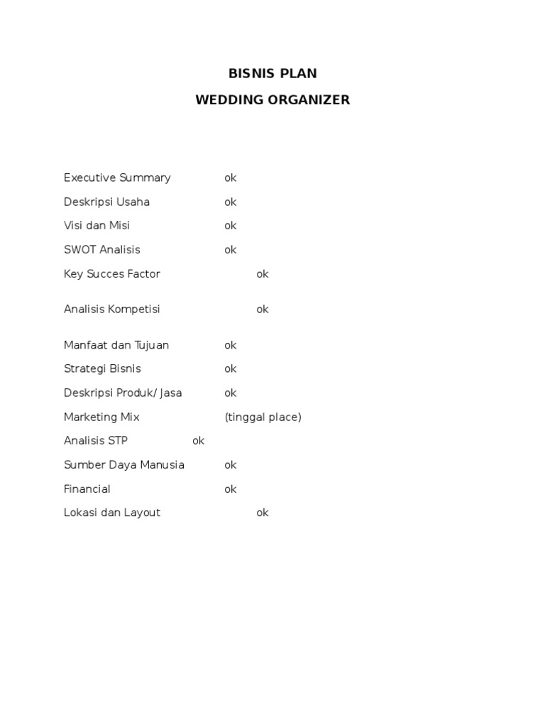 Bisnis Plan Wedding Organizer - PDF Free Download Tulisan ini memuat proposal bisnis atau proposal bisnis planDeskripsi lengkap. Bisnis Plan Kaos. Rancangan usaha pakaian yang siap dipasarkanFull description. Bisnis plan wedding organizer. Executive Summary. ok.