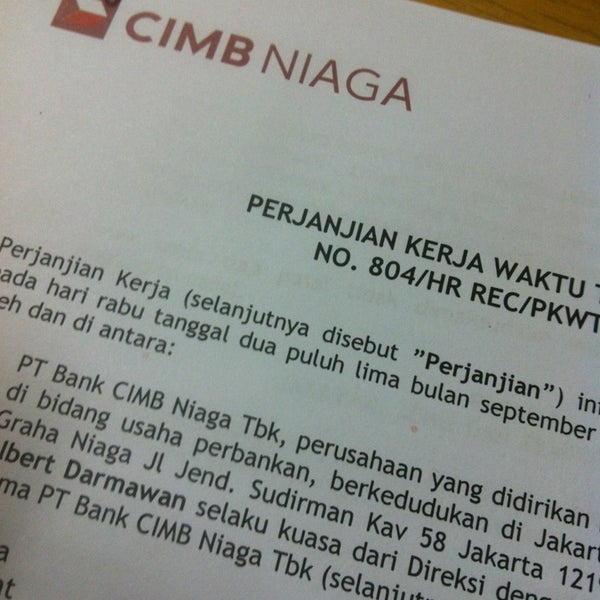 Hari kerja bank cimb niaga. Mau ke Bank Hari Sabtu-Minggu? Ini Daftar Kantor Weekend ... Melakukan transaksi perbankan tidak harus meluangkan waktu khusus dengan mengambil sela-sela waktu di padatnya hari kerja hanya untuk mendatangi kantor cabang bank. Bagi Anda nasabah CIMB Niaga, manfaatkan kemudahan bertransaksi perbankan di jam dan hari akhir pekan dengan kecanggihan teknologi di weekend bangking CIMB Niaga terdekat. 22 Jam Buka Bank Cimb Niaga - Info Dana Tunai Bank cimb niaga buka setiap hari senin sd jumat mulai pukul 0800 sd 1545. Jam kerja cimb niaga 5 hari dalam seminggu dan 75 jam dalam sehari. Pt bank cimb niaga tbk atau cimb niaga menyesuaikan jam layanan kantor cabang menjadi pukul 0800 sampai dengan 1500 waktu setempat. Jam berapa bank cimb niaga buka. CIMB Niaga - Kejar Mimpi Suku Bunga & Porsi Bagi Hasil Nisbah Tabungan CIMB Niaga. Pengumuman 08 Okt 2021. Pengunduran Diri Presiden Direktur dan CEO PT Bank CIMB Niaga Tbk. Berita 22 Okt 2021. Forum Indonesia Bangkit Vol.3: Optimisme Pemulihan Ekonomi 2022. Berita 29 Sep 2021. CIMB Niaga Dukung Tim Gerakan Nasional Bangga Buatan Indonesia. Berita 28 Sep 2021. Lowongan Kerja PT Bank CIMB Niaga Tbk - lokerbumn.com Lowongan Kerja PT Bank CIMB Niaga Tbk. 2022-01-01. Lowongan Kerja Bank CIMB Niaga. PT Bank CIMB Niaga didirikan pada tanggal 26 September 1955 dengan nama Bank Niaga. Selama dekade awal operasinya, fokus Bank adalah membangun nilai-nilai inti dan mengembangkan profesionalisme di bidang perbankan.