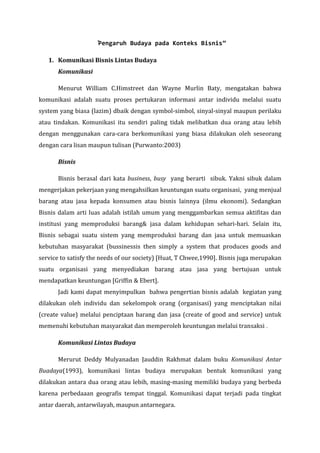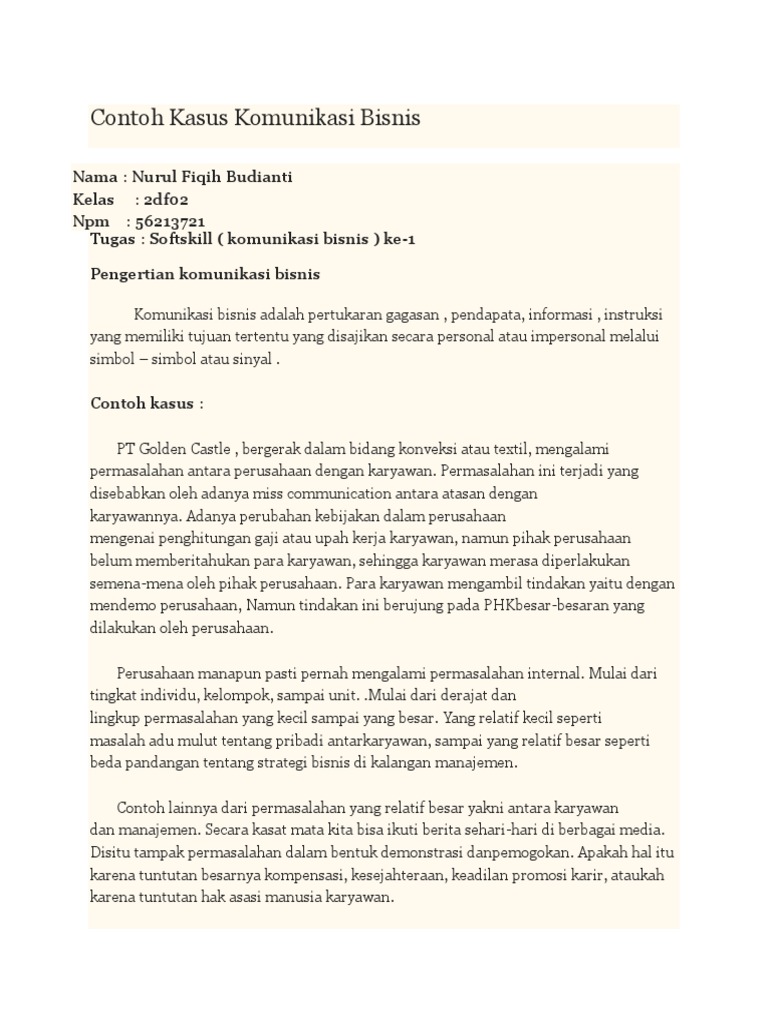 (DOC) Contoh Kasus Pentingnya Komunikasi Lintas Budaya ... Contoh Kasus Pentingnya Komunikasi Lintas Budaya dalam dunia Bisnis Disney in France Disney sebagai perusahaan yang mengembangkan konsep taman hiburan dalam bisnisnya telah berhasil meraih keuntungan di Amerika Serikat dan Jepang. Contoh Kasus Komunikasi Bisnis | PDF - Scribd Contoh kasus : PT Golden Castle , bergerak dalam bidang konveksi atau textil, mengalami permasalahan antara perusahaan dengan karyawan. Permasalahan ini terjadi yang disebabkan oleh adanya miss communication antara atasan dengan karyawannya. Adanya perubahan kebijakan dalam perusahaan Komunikasi Bisnis Lintas Budaya - Pengertian - Hambatan ... Menurut Tian Guang dan Dan Trotter (2012), yang dimaksud dengan komunikasi bisnis lintas budaya adalah komunikasi bisnis diantara konsumen atau antara konsumen yang berbeda budaya dengan pemasar paling tidak pada salah satu aspek dasar budaya seperti bahasa, agama, norma-norma sosial, nilai-nilai, pendidikan, dan gaya hidup. (DOC) Contoh Kasus Komunikasi Antar Budaya | Ranggi ... Ritual ini cenderung mengecilkan ungkapan opini yang berbeda dari patriotik nasionalis pada pertimbangan demokratis (Michael Butterworth, 2005). Cara manusia menegosiasi hubungan mereka untuk budaya populer memang rumit dan kerumitan ini yang membuat pemahaman tentang peran budaya populer dalam komunikasi antar budaya sangat sulit.