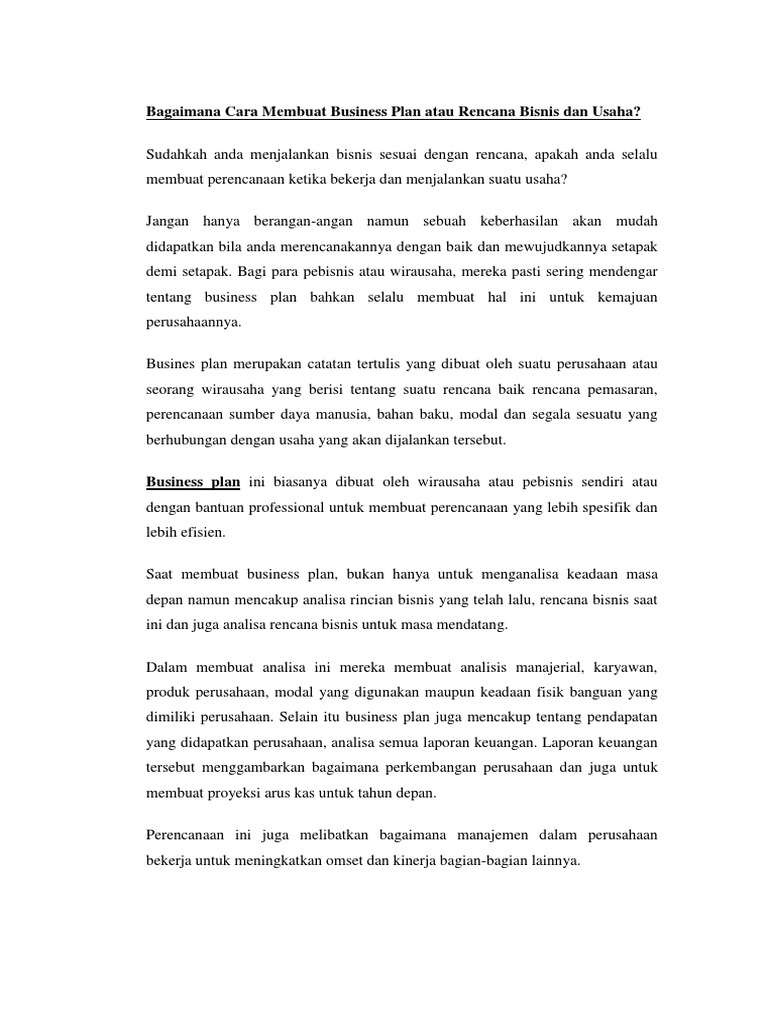 Cara Membuat Bisnis Plan [Update Terkini 2018] | Panduan ... Cara Membuat Bisnis Plan [Update Terkini 2018] June 28, 2018 4 Mins Read. Jika Anda sedang mempelajari bagaimana cara membuat rancangan bisnis atau berencana akan membuat proposal bisnis yang baik, maka tulisan ini pas buat Anda. Daftar isi: Latar belakang, Kerangka bisnis plan, Kaidah pembuatan, Contoh bisnis plan.