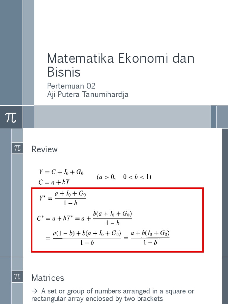 PDF Matematika Ekonomi Dan Bisnis Matematika Ekonomi dan Bisnis bertujuan memberikan pengertian yang lebih mendalam tentang konsep-konsep dasar ilmu ekonomi dengan menerapkan matematika dalam bahasan-bahasannya. Diktat bahan ajar ini berisi uaraian, contoh-contoh soal dan latihan mengenai penerapan konsep-konsep matematika dalam bidang bisnis dan ekonomi.