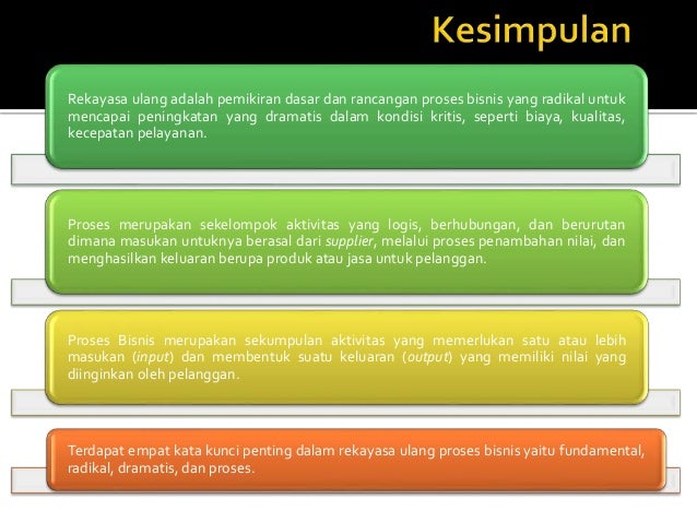 (DOC) Rekayasa Ulang Proses Bisnis - Academia.edu Rekayasa Ulang Proses Bisnis (business Process reengineering/ BPR) adalah mencari dan mengimplementasikan perubahan radikal dalam proses bisnis utuk mencapai terobosan baru pada produk dan jasa. Langkah-langkah BPR : 1. Identifikasikan proses-proses yang akan di-rekayasa ulang Pahami proses yang menjadi kunci proses bisnis. Business Process Reengineering - Wikipedia Business Process Reengineering ( BPR, Rekayasa ulang proses bisnis) adalah pemikiran kembali secara fundamental dan perancangan kembali proses bisnis secara radikal, dihasilkan dari sumber daya organisasi yang tersedia. BPR menggunakan pendekatan untuk perancangan kembali cara kerja dalam mendukung misi organisasi dan mengurangi biaya.