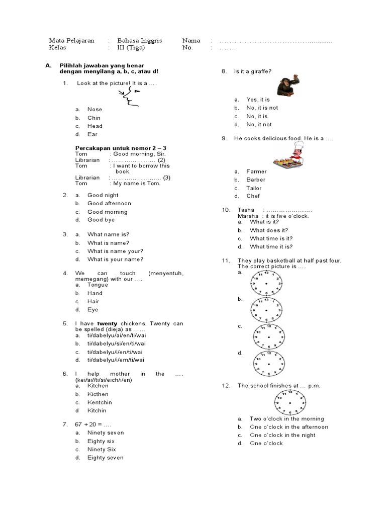 Soal Bahasa Inggris Kelas 3 SD/MI, PG/Essay 2022 Semester 1/2 Soal Bahasa Inggris Kelas 3. Artikel materi membahas Soal Bahasa Inggris Kelas 3, SD/MI, PG dan Essay, semester 1/2, Kurikulum tahun 2020-2021, lengkap dengan kunci jawaban, pelajaran IBI. Bahasa Inggris , ,, Ini adalah salah satu mata pelajaran yang mempelajari bahasa yang sering terdengar di dunia maya dan menggunakan bahasa asing untuk ...