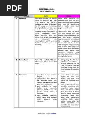 Jaminan Fidusia: Pengertian, Dasar Hukum, Jenis dan Contohnya Lain halnya dengan fidusia, gadai cenderung tak membutuhkan proses pendaftaran. Tak hanya itu, gadai juga memberikan kendali penuh pada pemegang gadai. Sedangkan, fidusia adalah praktik yang mengutamakan kepemilikan utama terhadap kreditur. Hal terakhir yang membedakan gadai dan jaminan fidusia adalah proses eksekusinya. PDF Bab Iii Pembahasan Persamaan Dan Perbedaan Antara Konsep ... Konsep konsep hak jaminan resi gudang dan Rahn (gadai) sama-sama merupakan salah satu sarana yang memberikan manfaat luar biasa bagi masyakat untuk menutupi kebutuhan kehidapan mereka sehari-hari.Berikut ini ada beberapa persamaan antara rahn (gadai) da n hak jaminan resi gudang. 1.