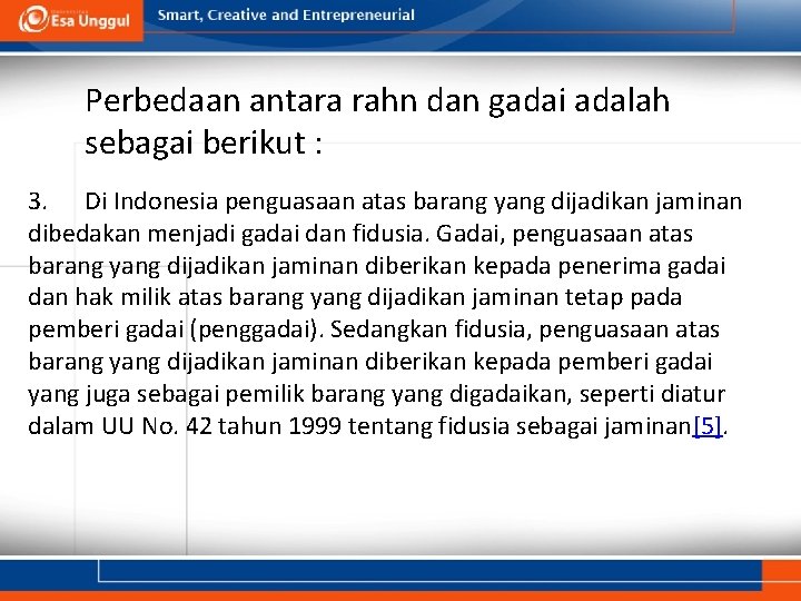POST 2.docx - Persamaan dan perbedaan antara gadai dan ... Pada gadai, pengertian gadai secara terang dan jelas di jelaskan pada Pasal 1150 KUH Perdata, sedangkan untuk pengertian fidusia sendiri terletak pada Pasal 1 angka 1 UUJF serta perbedaan fidusia dan gadai, dimana fidusia harus didaftarkan namun gadai tidak perlu didaftarkan.