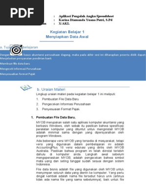 RPP Komputer Akuntansi Kelas XII SMK Kurikulum 2013 Revisi ... File data bisnis adalah file yang digunakan oleh MYOB untuk menyimpan seluruh data yang dientri ke komputer. Yang perlu dingat kembali adalah nama file tersebut harus unik (artinya tidak ada nama file yang sama sebelumnya), baik untuk file yang sudah eksis atau yang akan dibuat. Data yang dibutuhkan pembuatan File Data baru adalah: